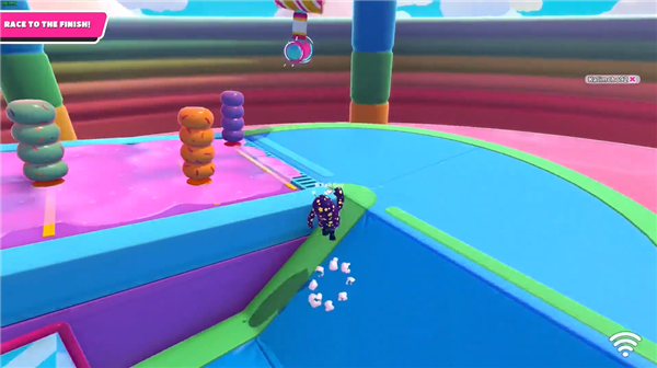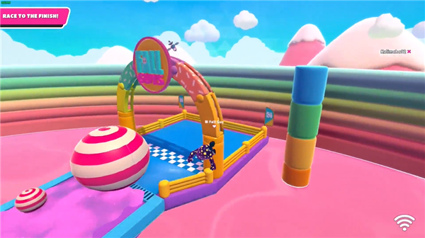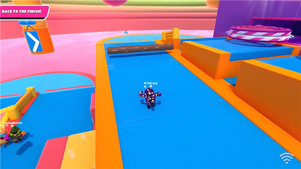 本地图分为八段障碍赛道。跑过三个障碍物后来到第一段推推赛道(也可从弹跳垫上弹上来但存在一定风险),找准时机通过。