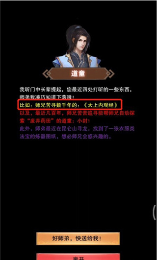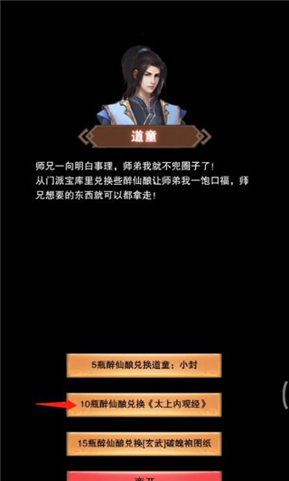 6、聊到最后,可以通过使用10瓶醉仙酿,跟道童兑换太上内观经。