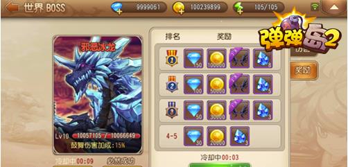《弹弹岛2》的世界BOSS奖励发放是取决于伤害值累积的排名,除了争取单次挑战打出更高的伤害值,玩家还可以根据自己情况来选择是否增加挑战次数,也就是消耗钻石来减少冷却时间,挑战次数增加,自然总伤害值就会增加,奖励自然也就更多。BOSS被击败或者BOSS活动时间结束,系统就会根据玩家伤害值排行来派发奖励。