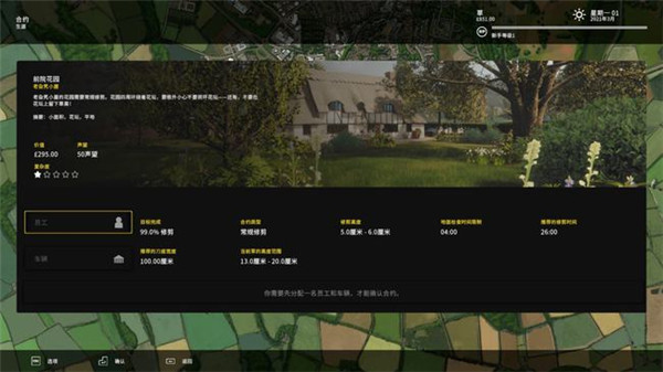 3、在正式开始游戏前我们还需选择任务,点击详情还能看到相关的细节,内含报酬、时间要求、修剪高度、以及目标完成度。在这一环节我们必须仔细斟酌,如若不然整个任务将有重开的风险,到时候既浪费了时间又拿不到赏金,自己还得赔钱加油修机器,可谓得不偿失。