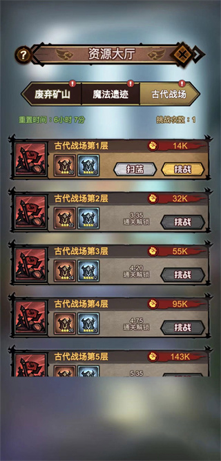 玩家每天都会有两次免费的挑战次数,每个地区都有哦,这一点玩家们可以放心的进行挑战,挑战胜利的玩家会获得相应的资源,有的玩家会得到20个3星的英雄碎片,幸运的玩家可以直接获得10个4星级的英雄碎片,这就要看玩家们的英雄角色阵容怎么样了,阵容如果超过对方战力值的话就可以直接挑战,如果没有超过甚至平等,小编建议玩家们重新整顿一下阵容,再来挑战古代战场。