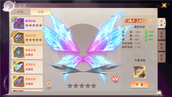 每一个幻化出来的羽翼都是独一无二的,羽翼修炼的境界高了,还能幻化出不同的外观,可以自由选择羽翼的展示形态。