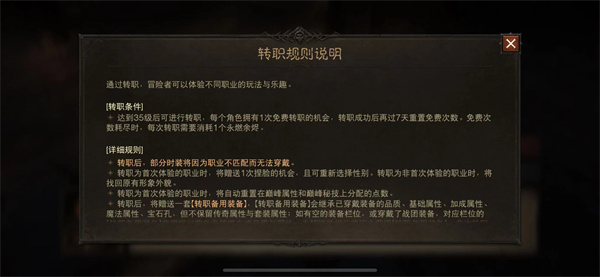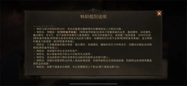 5、第一次变更职业时,玩家可以获得一套适合新职业的装备和物品,并将原有的装备打造和宝石镶嵌转移过来