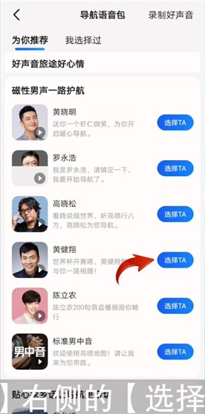 接着下拉页面,在【磁性男声一路护航】栏点击【黄健翔】右侧的【选择TA】按钮即可。
