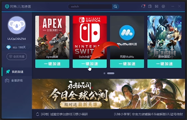 1.在电脑端的网易UU中,点击上方的搜索栏,随后在搜索栏中搜索switch商店加速或者相应的游戏名称即可将游戏添加到加速列表中。