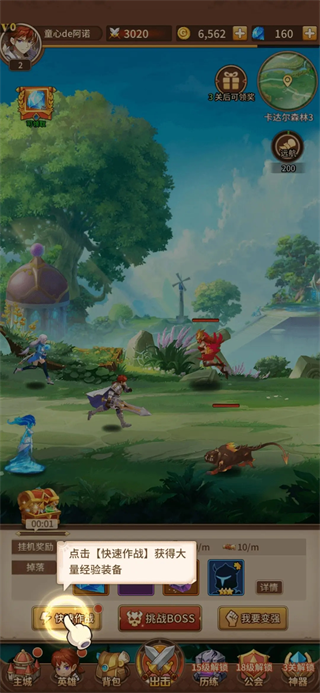 如上图,“快速作战”的机制是等级越高给的经验越多,所以这个时候点是不明智的,一般是等到二十多级没办法推图的时候才用,这样在第一天就可以达到25级或以上,解锁“无尽试炼”,如果提前用掉“快速作战”就没办法达到25级,这时候就需要用到上面教的小技巧,跳过新手指导。