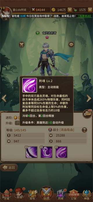 如图,亡灵收割者的第三个技能带有百分百伤害,而公会boss就是血多伤害低,亡灵收割者就可以达到很好的效果,轻轻松松拿到输出榜一,而且升到九星可以当粮,非常好用。