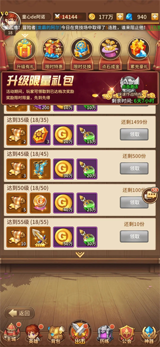 这个活动是刚开服的时候开的,奖励不错,值得一抢,另外55级的奖励只有十份,而且奖励对于前期很有用,没开速战特权自然就抢不到了。这个没什么讲究,在第5天00:00蹲点抢就行,到55级之后就是我上面提到过到,屯“挑战boss”。