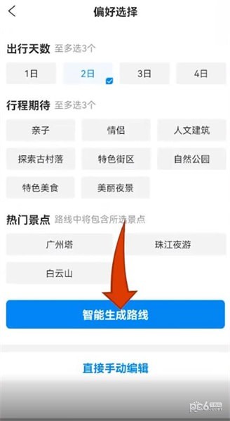 第四步,选择偏好,点击智能生成路线。