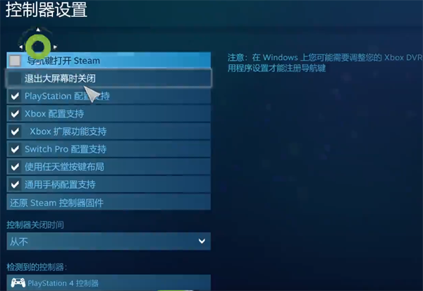 2.点击steam大屏幕模式中右上方的齿轮选项,随后选择控制器设置即可查看自己插入的手柄设备,若是没有识别手柄可以通过勾选手柄选项来设置手柄的支持,点击手柄选项也可以直接设置手柄本身键位设置。