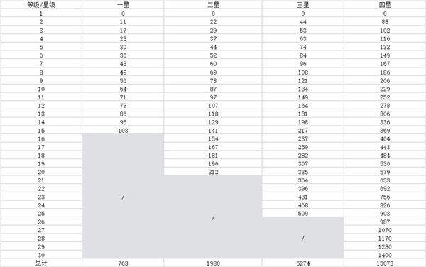 以下为1-4星强化各个等级所需消耗的陨铁数量: