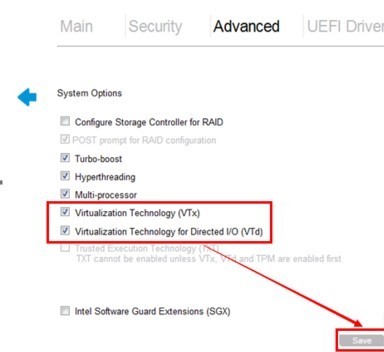 1、进入BIOS页面后,找到“Advanced(高级)”——“System Options(系统信息”找到并勾选“Virtualization Technology-VTX(虚拟化技术VTX)”以及”Virtualization Technology-VTD(直接I/O虚拟化技术-VTD)“2个选项