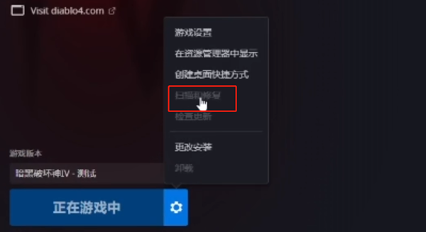 检查一下游戏文件是否完整,出现这个问题也是因为游戏文件缺失导致的,我们点击游戏客户端的齿轮按钮,点击扫描和修复即可。