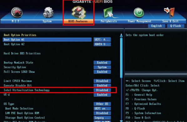 1、进入BIOS页面后,找到“BIOS Features”——“Intel Virtual Technology”和“VT-d”选项,把“Disabled”都修改为“Enabled”;