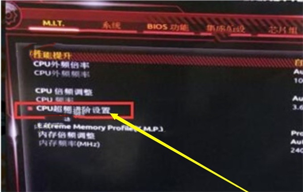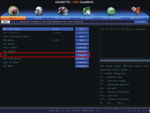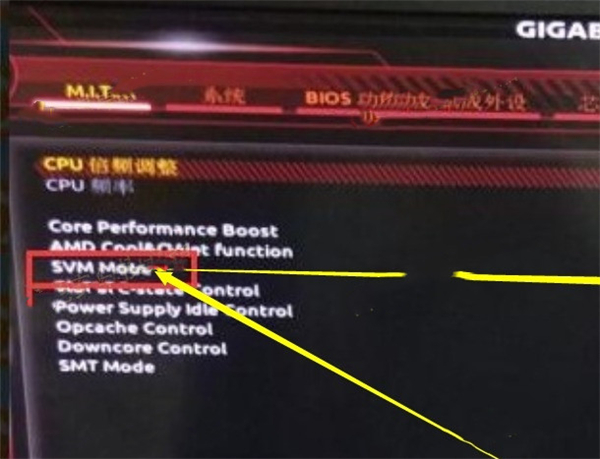 1、进入BIOS页面后,找到“M.I.T”——“高级评率设定”或“Advanced Frequency Settings”——“CPU超频高级进阶设置”或“Advanced CPU Core Settings”——“SVM”选项,把“Disabled”修改为“Enabled”;