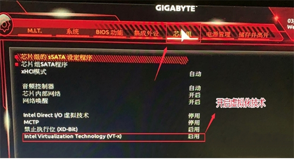 1、进入BIOS页面后,选择“芯片组”找到 "Intel Virtualization Technology (VT-x),把“Disabled”修改为“Enabled”,或把“停用”修改为“启用"