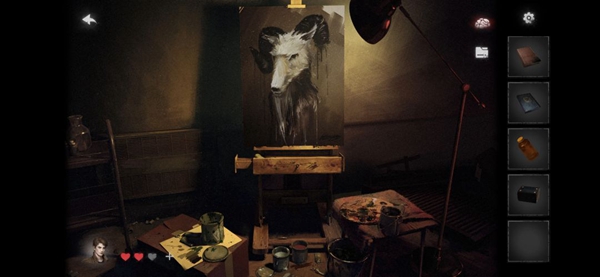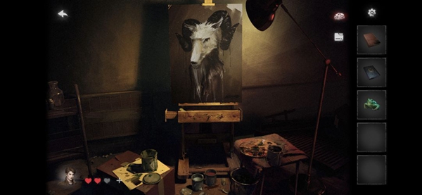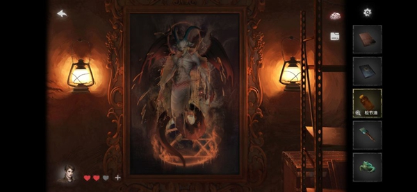 15、到达房间中间的画像前,泼洒松节油,然后按照提示依次使用刷子画出蝙蝠、羊、蛇和青蛙。