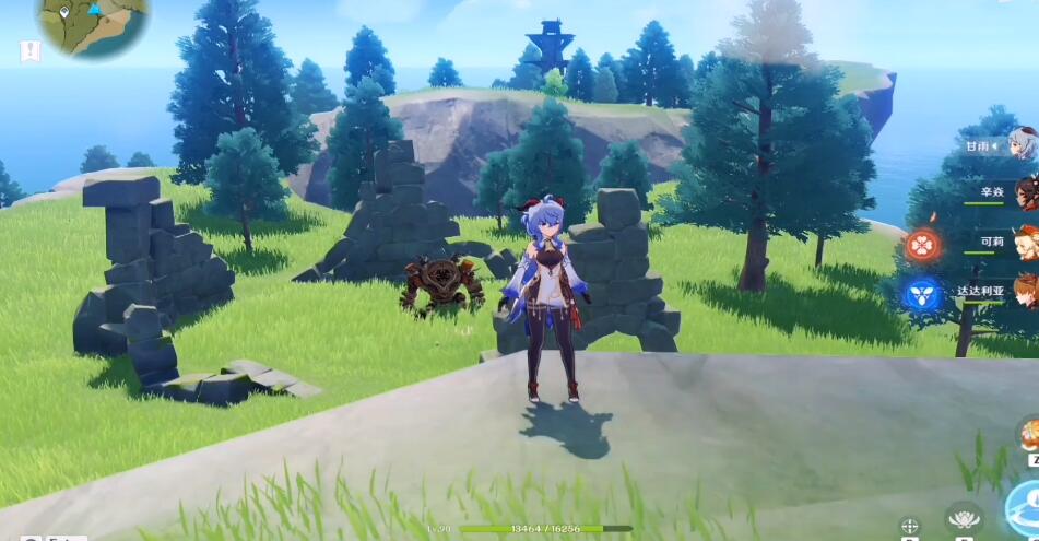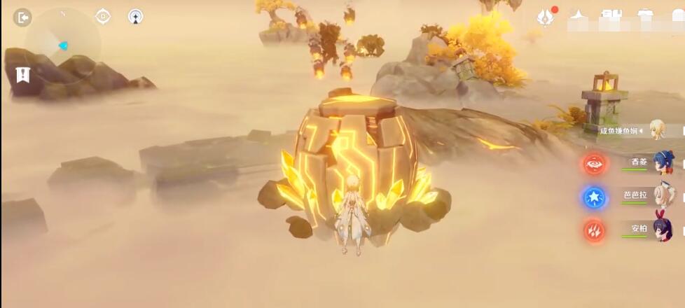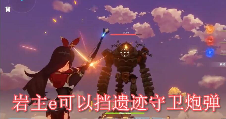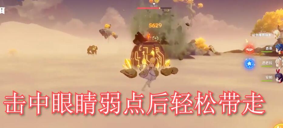 3、遗迹守卫的弱点在眼睛上,推荐使用弓箭角色射中,手残党可能有些困难,推荐带一个迪奥娜,开盾再射;
