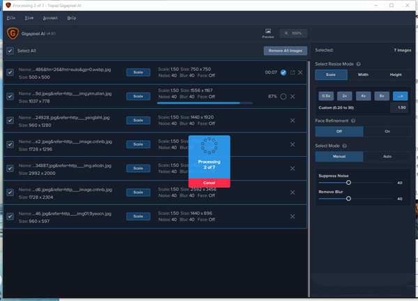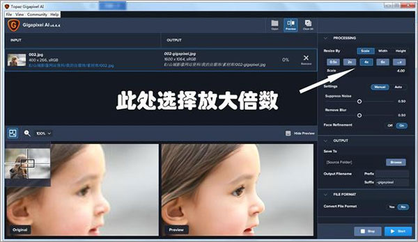 3、打开图片以后,图片开始自动处理,数字到100%表示处理完毕。这个时候我们看一下右边栏的一些调节参数。Select Resize Mode为选择调整大小的模式,这个一般不需要调整。第二项为放大的倍速,选择最后一个可以自定义倍速,我一般放大1.5倍。下一个Face Refinement为面部修复,默认关闭,如果需要修复人像可以打开。我们看一下修复效果。