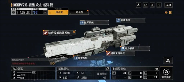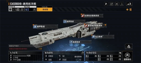 对舰输出能力十分优秀的巡洋舰,作为唯一一艘搭载了能量武器的基础型巡洋舰,它所搭载的离子炮系统,可以对物理装甲厚重的大型舰船持续造成大量伤害, 在游戏的中后期,可以担当主力输出的位置,但缺点在于,它是前排舰船,且防御力并不算优秀,生存受威胁程度较大,可以考虑强化引擎中的增加闪避率项目。 强化方面,推荐优先点出主武器的命中和伤害,如果点数有结余,可以投入一些到副武器或者引擎上面,进一步强化它的输出或者生存能力。这是一艘一旦获得,便值得投入资源培养的优秀巡洋舰。