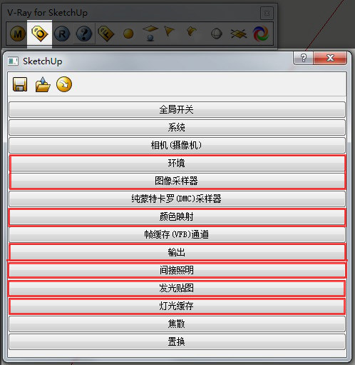 第二个是vray的参数面板,用于调试渲染的环境、间接光等参数,往后会展开说明。其中标记的项是一般需要调整的项,其它一般可以保持默认。