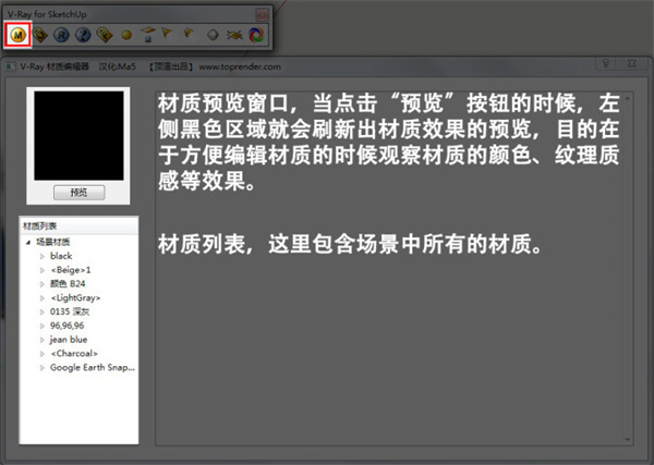 从左开始第一个按钮“M”是vray材质编辑器,用于编辑以及预览场景中对象的材质。