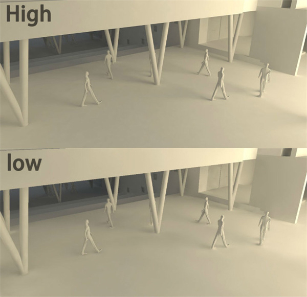 通过放大,可以看到左图(高)的阴影细节和画面平滑程度都要比右图优秀。【主要影响间接光照所产生的阴影】