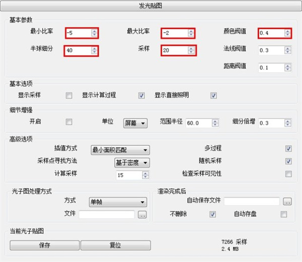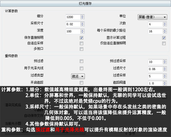 b、高参数:具体视场景而定,紧接下来会有设定方法,一般来说只需改变图像输出、图像采样器、发光贴图和灯光缓存的参数。