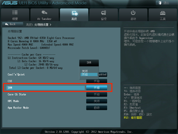 2、找到“高级(Advanced)”——“处理器设置( CPU Configuration)"—— “SVM”选项,把“Disabled(关闭)”修改为“Enabled(开启)”