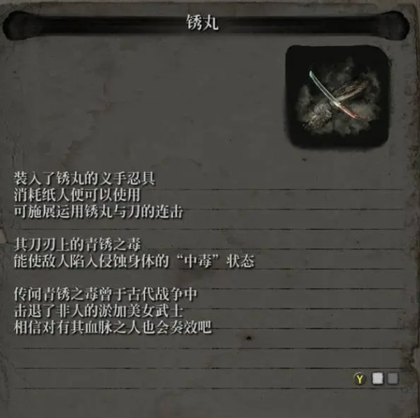 2、作用:装入了锈丸的义手忍具,消耗纸人便可以使用,可施展运用锈丸与刀的连击,其刀刃上的青锈之毒能使敌人陷入侵蚀身体的“中毒”状态。
