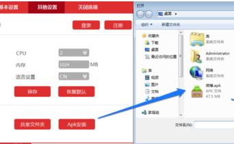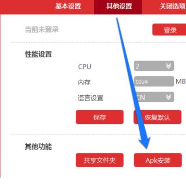 3、在海马玩模拟器的其它设置中我们可以设置CPU、内存以及语言等,我们还可以选择apk安装