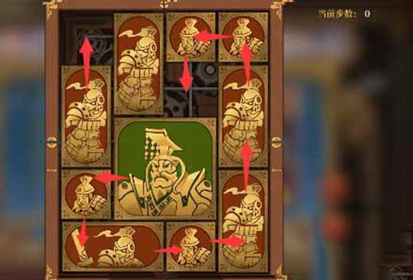 1、左上角竖直方块向上一格,右上角小方块移动到中间的空位,右侧全体上移,下侧全部右移,左侧小方块向下移一格,然后将军向左一格。