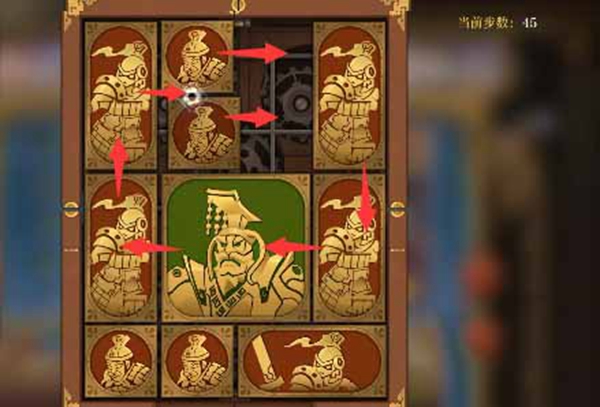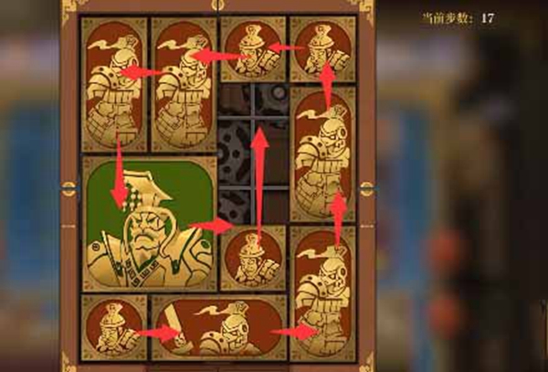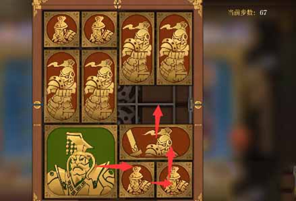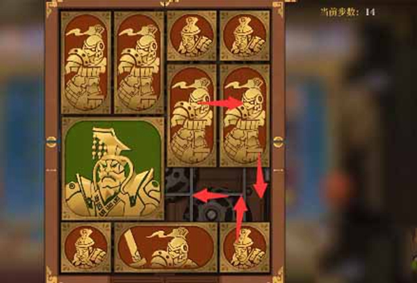 4、右下的小方块向上移动,将军向右一格,左上角的竖直方块向下,上方全员向左,右侧全部方块向上一格,左下角的水平方块和小方块向右一格。