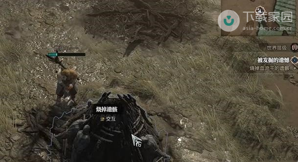 3、接着玩家需要跟随指引来到下图位置,到达之后需要将血流干的遗骸烧掉;