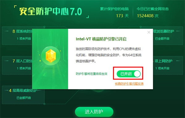 情况3,与360安全卫士核晶防护冲突了。打开360安全卫士→左下角点 防护中心→打开 360安全防护中心→右上角第一个按钮→关闭核晶防护;