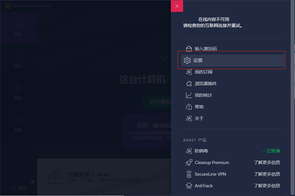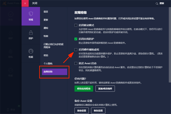 情况4,与Avast Free Antivirus硬件辅助虚拟冲突,打开Avast Free Antivirus→右上角“三”菜单→打开设置→故障排除→关闭“启用硬件虚拟辅助”。