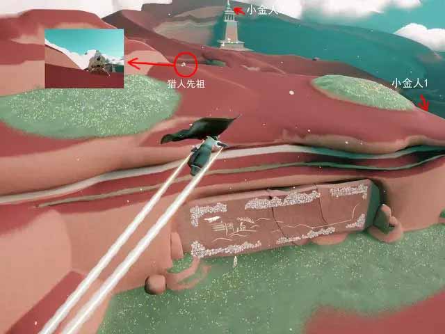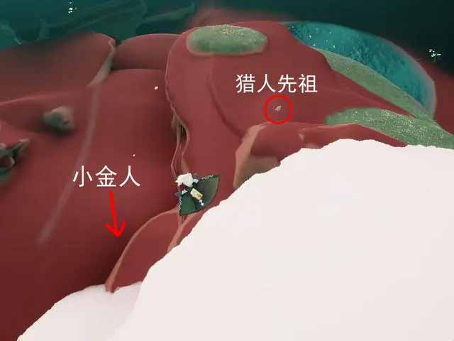 顺便说下,九色鹿季有两个小金人,在这张图上,大致方位可以一目了然,一个就在猎人所在的山坡的右下方。 另一个小金人,在宫殿最高的塔尖上背面。