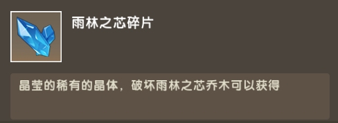 破坏雨林之芯乔木,可以得到雨林之芯碎片,雨林之芯碎片有着漂亮的蓝色外观。
