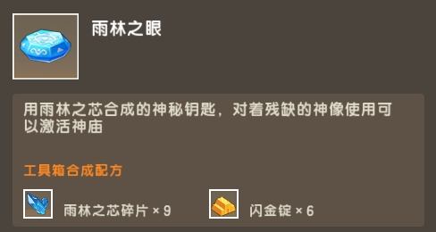使用雨林之芯碎片和闪金锭,可以合成关键道具:雨林之眼,它是开启神庙挑战羽蛇神的关键钥匙!