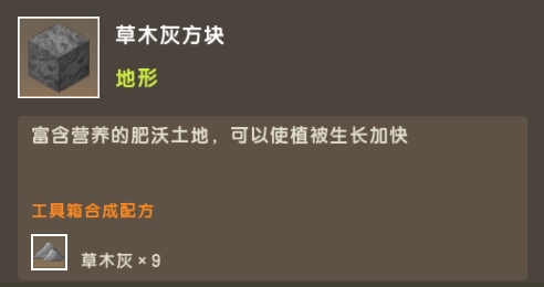 草木灰方块富含丰富的营养,种植在草木灰方块上的作物,相比种植在土块上生长会更迅速哦~
