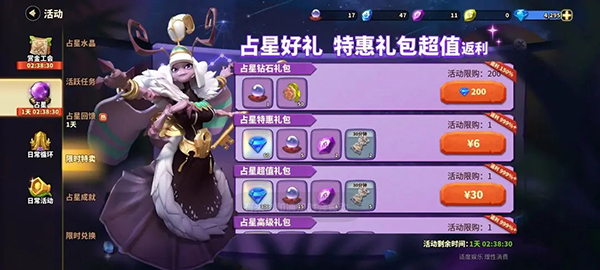 每次限时活动开启玩家都可以通过活动限购砖石购买道具礼包一般为200次,往往这些活动都有保底和使用优惠,作为一名资源抽奖玩家手里筹码达到保底范围进行抽奖是最为安全的。