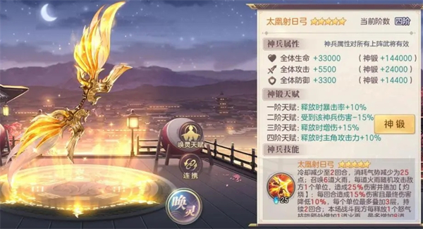 2、太凰射日弓:多段伤害,总输出最高的神兵,伤害附带灼烧,适合全部阵营,尤其是持续型阵容和烧烤队。