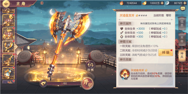 2、天墟盘龙斧:针对敌方后排攻击的神兵,会对标记敌方后排,使其受到的神兵伤害增加50%,适合偷后排队,搭配苍天帝剑,效果格外突出。