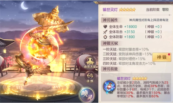 镇世灵灯:纯伤害神兵,有收割效果但基础伤害太低,适合全阵容但是优先级最低,在太凰射日弓的光芒下毫无用武之地,属实悲惨。