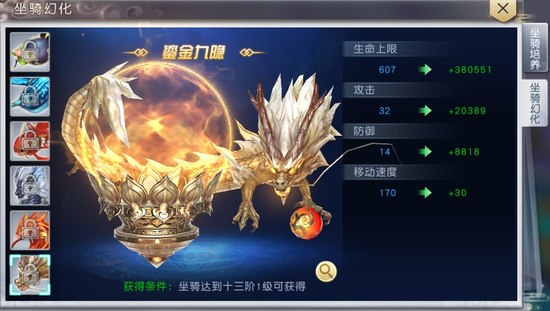 2、使用坐骑丹驯养坐骑能够提升坐骑的生命、攻击、防御等属性,为主人提供强力的加成。