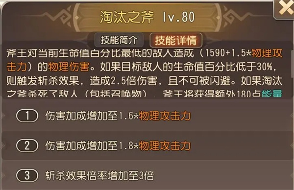斧王的大招——淘汰之斧,斧王的核心技能,处理大肉前排超高效的神技。潮汐全能等依赖吸收伤害开大招的英雄,非常惧怕这个技能。只可惜第三阶效果不是变成神圣伤害,如果是神圣伤害就不会偶尔出现斩杀不致死,或者冲冠一怒为红颜的情况了。斧王的核心技能之一,是斧王残局输出的保证。技能升级顺位在第二位。