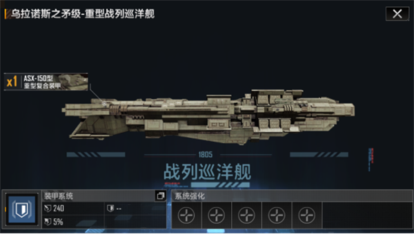 4、然后就是最肉战巡乌拉诺斯之矛级了,普通玩家可以无脑选,这艘战巡胜在水桶腰,并且肉度最高,同时武器模块的输出也不错,没有附加装甲的前提下血量可以到到22万左右,如果幸运的抽到了附加装甲模块,那么直接拉到24万左右的血量,配合500+的护甲,即使己方舰队不能打出很高的输出,也能在团战当中站的更久,让队友输出更长的时间。