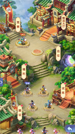 帮派基础功能里有帮派福利、建设、试炼、远征、竞赛等。