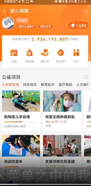 3、进入菜单之中的我的选项,在我的爱心捐赠项目之中点击捐赠项目。