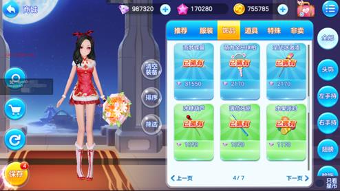 进入游戏商城之后,右侧会出现上百款服装、饰品等道具。各位音舞大大可在上方和左侧勾选需要换装的内容进行购买。